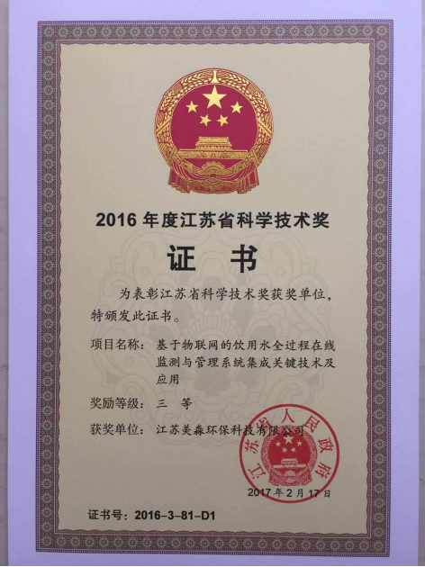 近日,全省科學技術獎勵大會落下帷幕,向全省優(yōu)秀企業(yè)頒發(fā)省科學技術獎,常州市僅16家獲獎,美淼環(huán)保位列其中,獲此殊榮。獲獎的“基于物聯(lián)網的飲用水全過程在線監(jiān)測與管理系統(tǒng)集成關鍵技術及應用”是美淼智慧水務系統(tǒng)的核心技術。